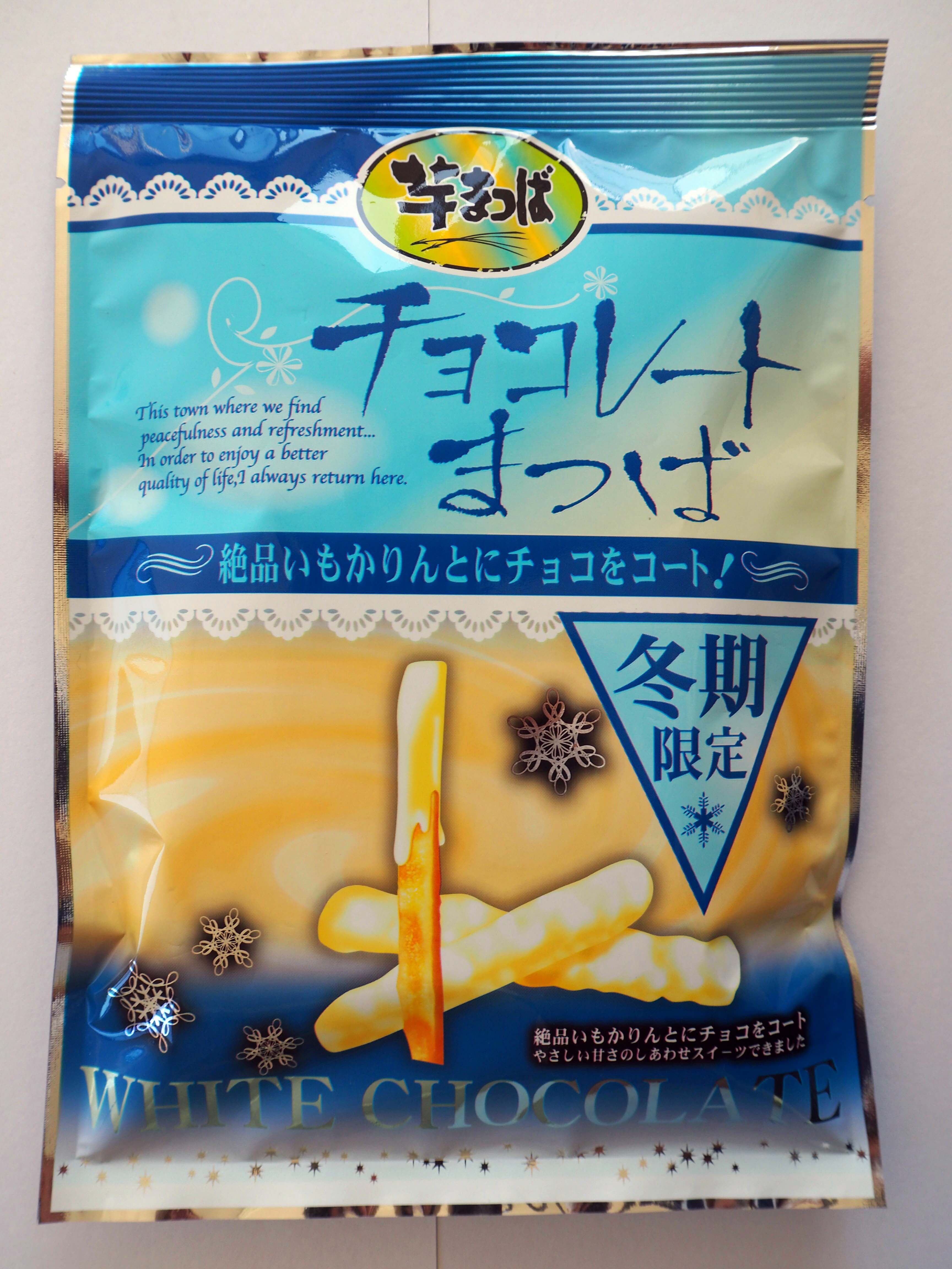 さつまいもをスティック状にカットしフライしたものに、ホワイトチョコのコーティングをしました。冬季限定商品です。